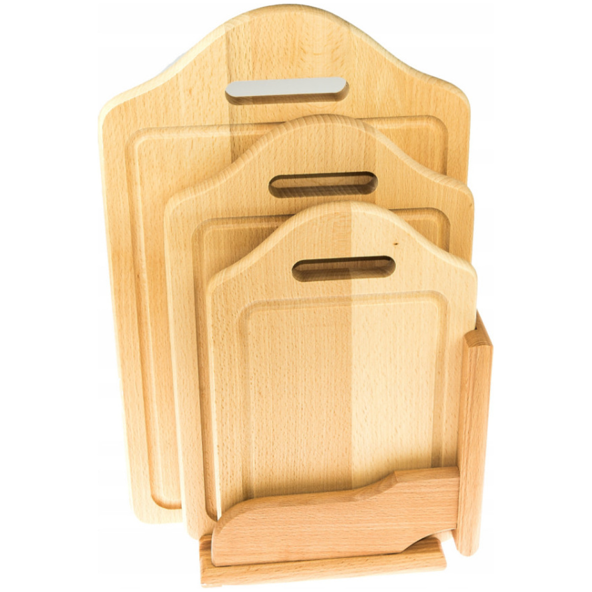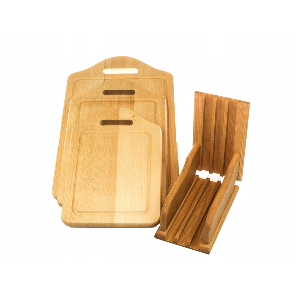 Z dumą prezentujemy trzy starannie wykonane deski umieszczone na solidnym stojaku, które nie tylko dodadzą klasy Twojej kuchni, ale również sprawią, że gotowanie stanie się prawdziwą przyjemnością. 🌟