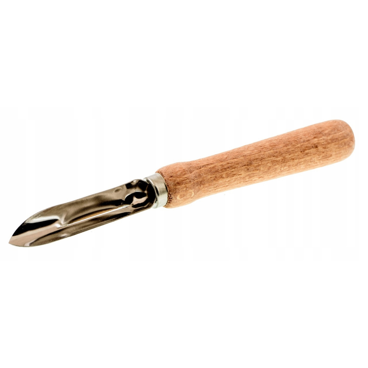 Obieraczki wykonana została ze stali nierdzewnej, posiada drewnianą rączkę, dzięki której jej użytkowanie jest bardzo wygodne. Obieraczka zakończona jest ostrym kolce, co umożliwia usunięcie zepsutych części warzyw/owoców.
