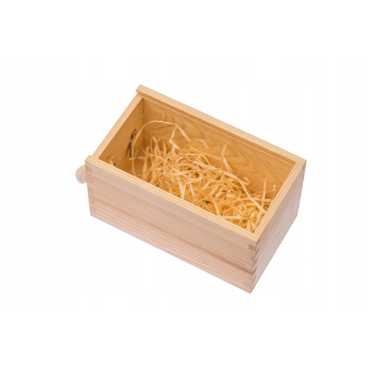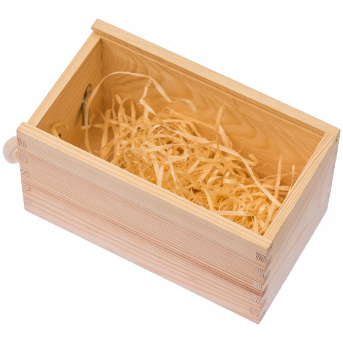 Pudełko wykonane z drewna świerkowego, front wykonany ze sklejki brzozowej 3mm. Sznur bawełniany naturalny zakuty w metalowe końcówki. Pudełko nie impregnowane NATURALNE. W zestawie dekoracyjna wełna drzewna.